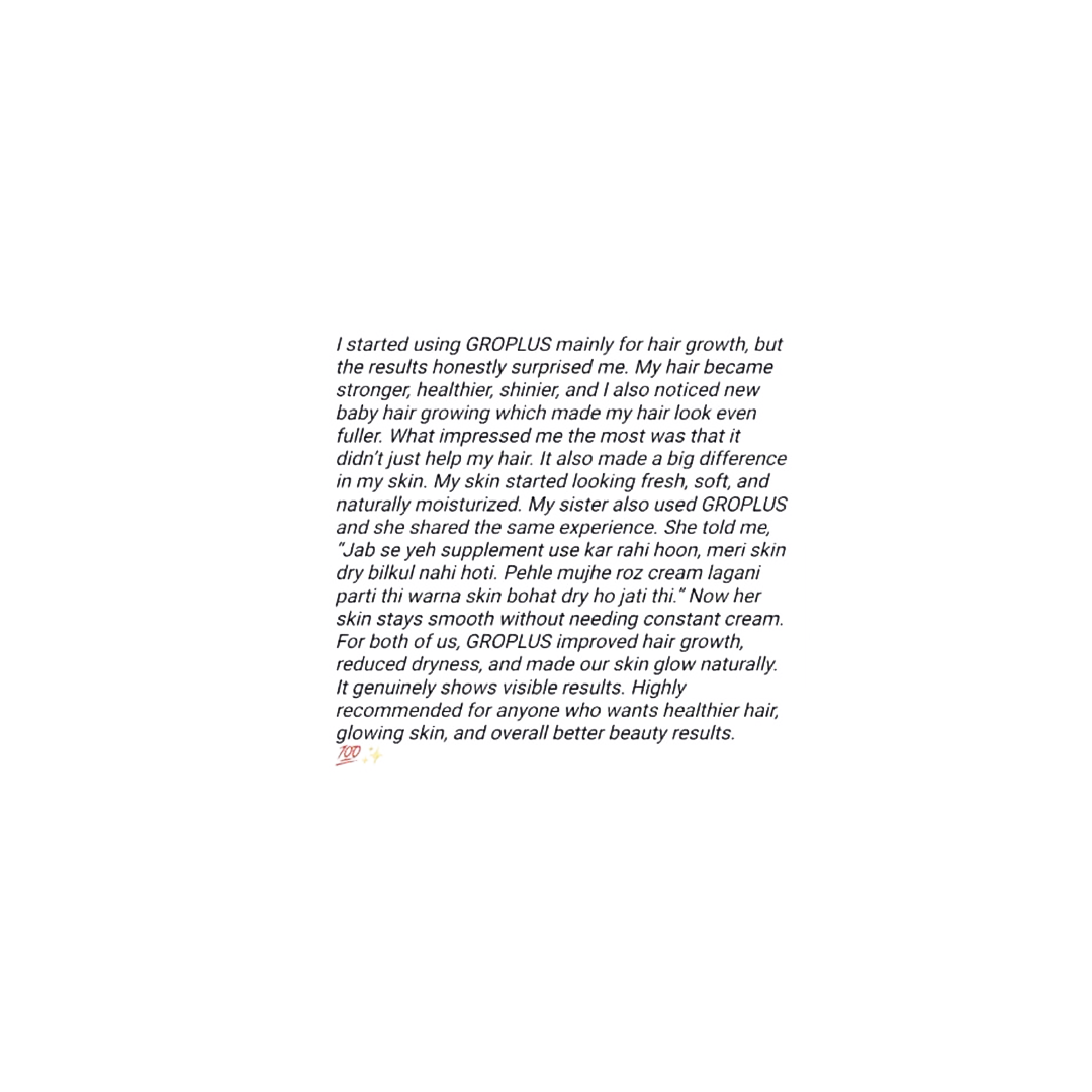 My sister also used GROPLUS and she shared the same experience. She told me, “Jab se yeh supplement use kar rahi hoon, meri skin dry bilkul nahi hoti. Pehle mujhe roz cream lagani parti thi warna skin bohat dry ho jati thi.” Now her skin stays smooth without needing constant cream.
